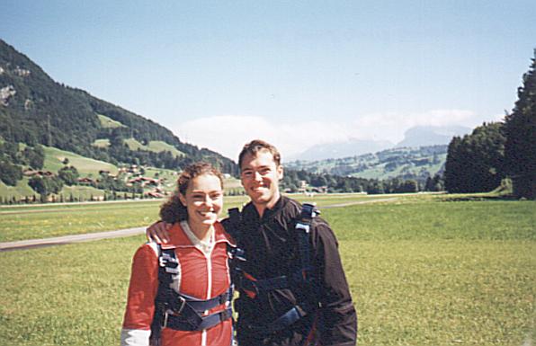 My body was in the specified banana shape with my neck straining backwards, so my eyes could gaze at the landscape beneath my body. I could see everything: the valleys, the mts, the villages, lakes, streams, rivers, etc. Then at 5000 ft., Phillipe yanked the rip-cord, pausing our fall for a brief moment. Then Phillipe allowed me to direct our flight, so I panned from one view of the mts to another. What a sight to behold! I was floating above one of the most beautiful mt. ranges in the world! And now I know why birds sing!"