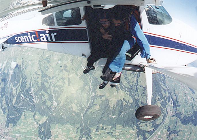 Never in my wildest dreams did I ever think that I would jump out of a plane from 10,000 ft over the Swiss Alps. The plane ride to the specified jump-site showcased empyrean snow-capped mts, opal-blue lakes, rambling streams, and clear blue sky that stretched far beyond the horizon. [And according to our jump-master Andre', we were only at 3,000 ft! - 7,000 ft to go!]